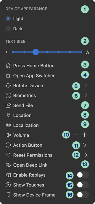 Biometrics - options for simulating biometric authorization on iOS. This option isn't available on Android. The following options are available: