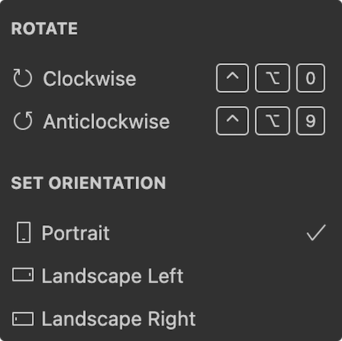 Settings dropdown allows for rotating the device Clockwise and Anticlockwise as well as choosing from supported orientations: Portrait, Landscape Left and Landscape Right.