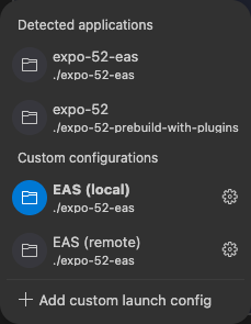 Allows you to configure or switch between different launch configurations set up in your workspace (e.g. letting you quickly switch between a development and staging profile). In a monorepo workspace, the drop-down also displays all automatically detected React Native applications, allowing easily selecting and switching between them.
