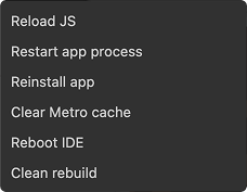 - Clear Metro cache - resets Metro bundler cache, reboots the device and reopens the application,